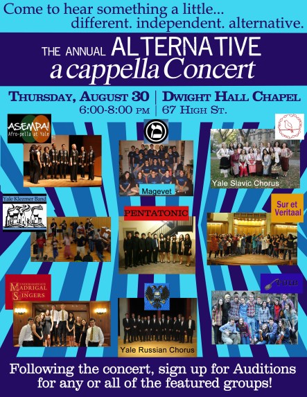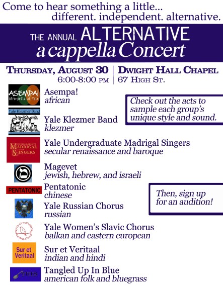 Hi everyone! Remember, this Thursday, August 30th, be sure to check out the Slavs at the annual Alternative A Cappella Concert! Check out the full roster of performing groups below. And scroll down below the fold to see our full calendar for beginning-of-the-year events!