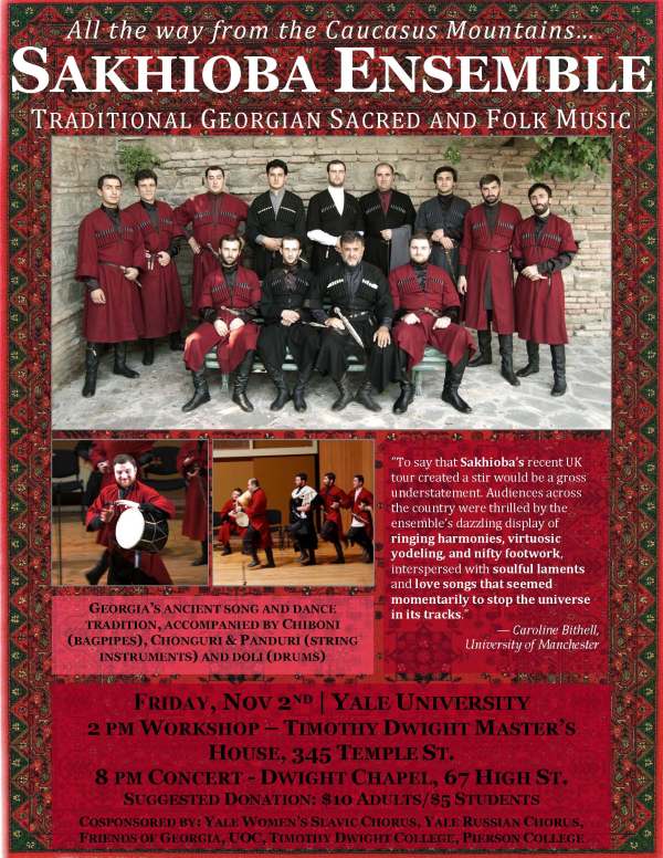 In one week, on Friday, November 2nd, join us for two very special events. Sakhioba Ensemble, a Georgian men’s choir specializing in traditional sacred and folk music, is touring the U.S. and stopping by Yale on their journey. Check out the information below for the details of their Yale stop, and follow this link to see the schedule for their full U.S. tour!