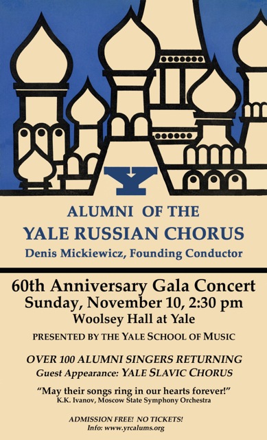 We’re thrilled to announce an upcoming concert — we’ve been invited to sing with the Yale Russian Chorus Alumni Association next week: Sunday, November 10th, at 2:30PM. Join the alumni of the Yale Russian Chorus in Woolsey Hall for their 60th Anniversary Gala Concert, featuring over 100 men’s voices in Russian Liturgical, Folk, and Composed Song. We hope you’re as excited as we are!