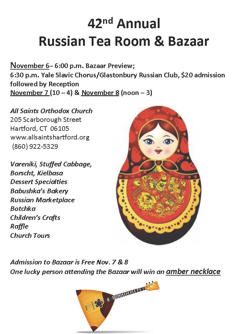 In a few short weeks, the Slavs will be performing at the All Saints Orthodox Church in Hartford, Connecticut! This will be our second year singing for their annual Russian Tea Room and Bazaar. See our event details below: